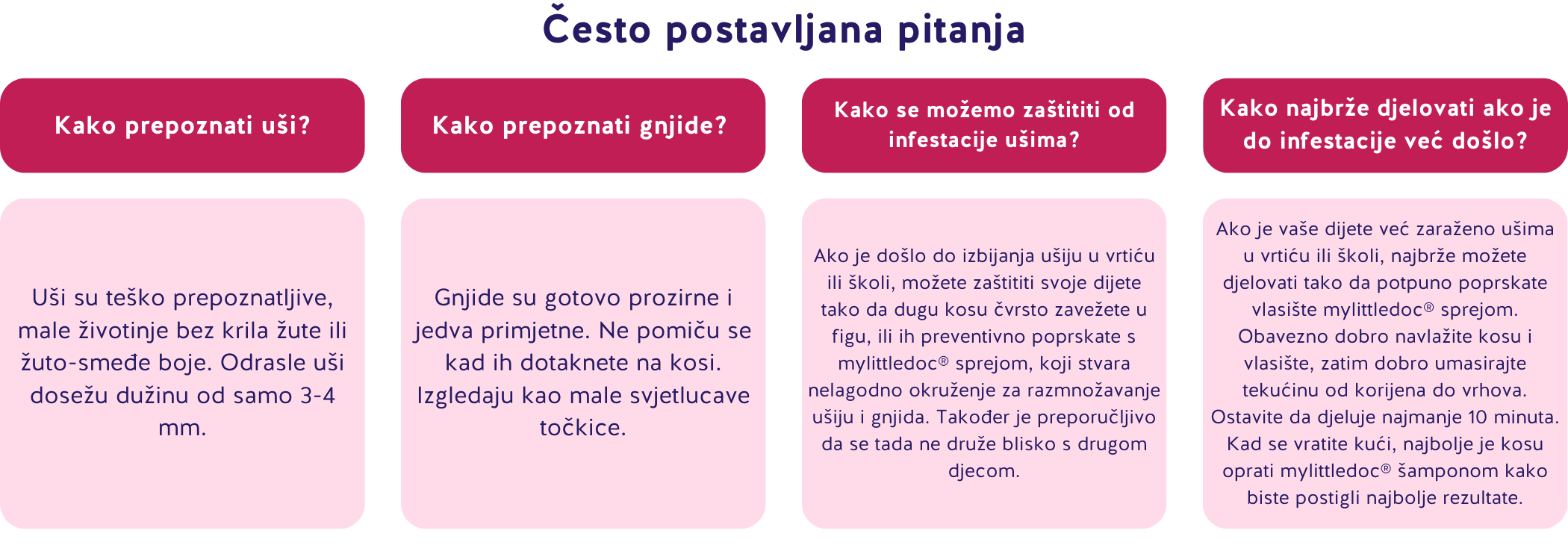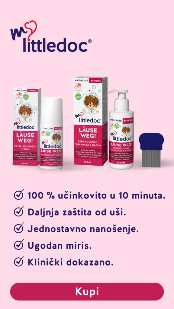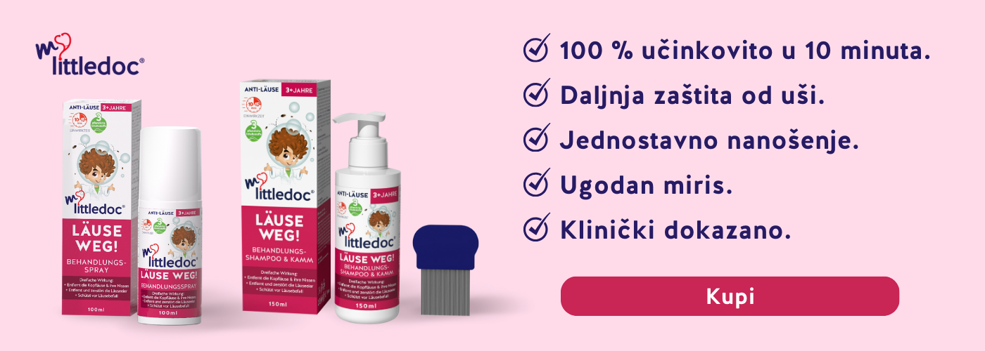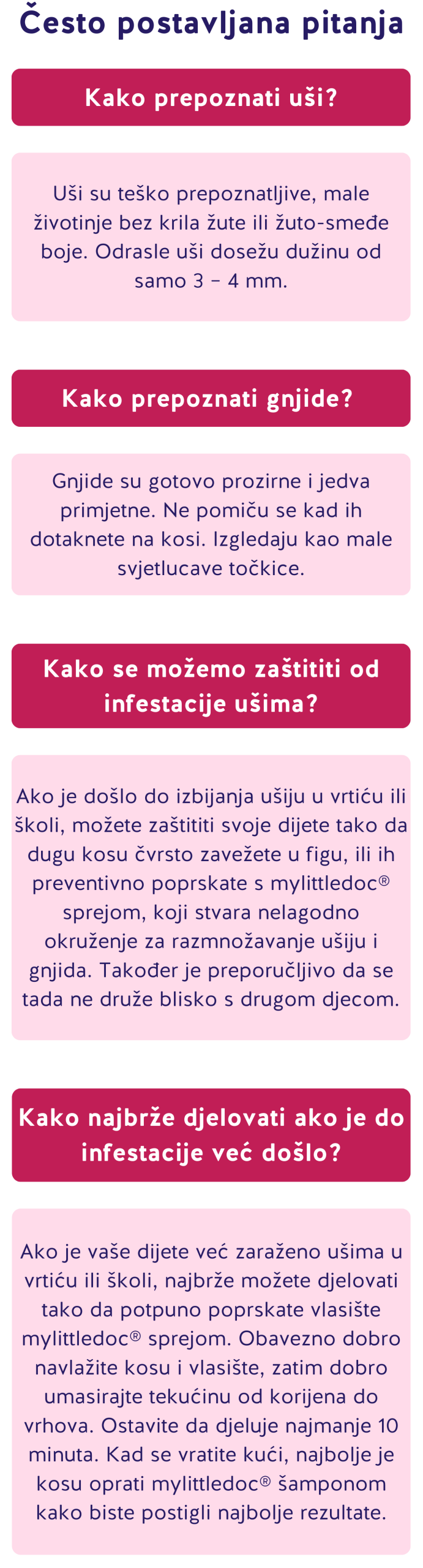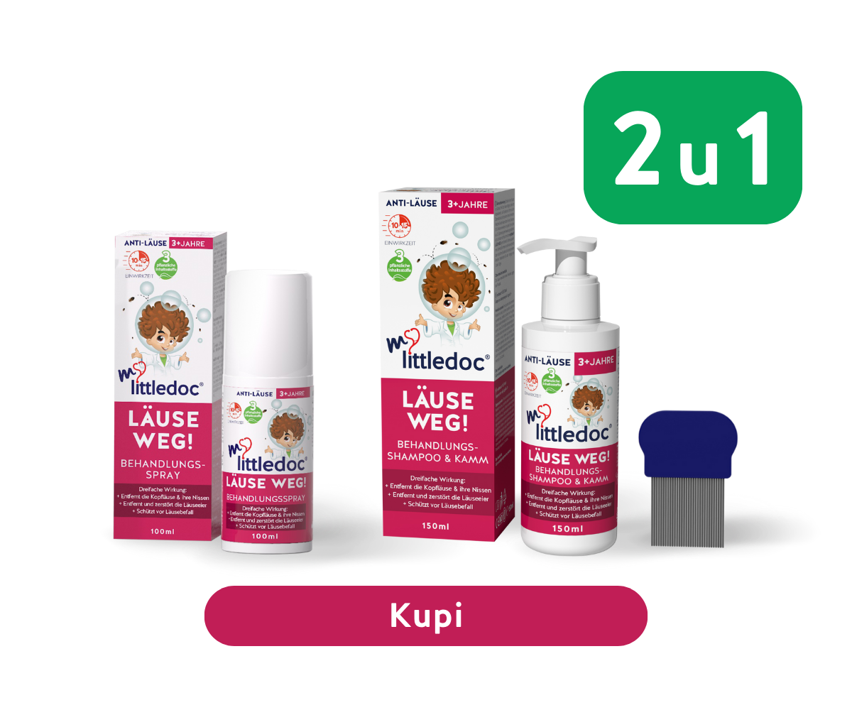 Šampon djeluje već za 10 minuta i uništava uši i gnjide prirodnim sastojcima. Nanosi se praktičnom pumpicom, ima tekuću strukturu i dobro se pjeni, što omogućuje da prodre u sve dijelove vlasišta. U paketu dolazi i češalj za lakše češljanje uši i gnjida nakon pranja. Nakon upotrebe, štiti od ponovne infekcije ušima i ostavlja ugodan miris na kosi. Također možete koristiti sprej. Djeluje već za 10 minuta i uništava uši i gnjide prirodnim sastojcima. Pruža zaštitu od infekcije ušima. Raspršite po kosi na udaljenosti oko 10 cm od od kose, pripazite da cijelu kosu i vlasište dobro navlažite. Zbog svoje konzistencije, tekućina ostaje na površini kose bez kapanja. Umasirajte tekućinu od korijena do vrha – posebnu pažnju posvetite vratu i području iza ušiju. Zatim češljajte kosu češljem kako biste uklonili uši pramen po pramen.