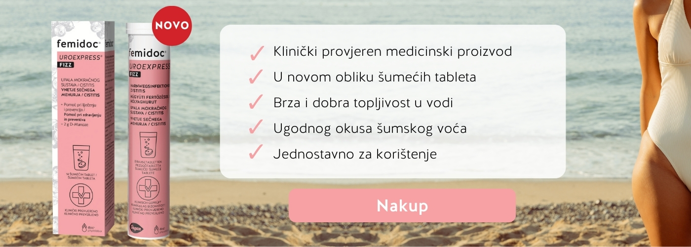 Već poznajete proizvode femidoc® UROEXPRESS®? Sada su dostupni i u obliku šumećih tableta za pripremu osvježavajućeg napitka. femidoc® UROEXPRESS® FIZZ klinički je provjeren medicinski proizvod brzog djelovanja, koji se koristi kao pomoć pri liječenju i prevenciji infekcija mokraćnog sustava. Također, može se uzeti i kao prevencija ako znamo svoje okidače upale mjehura, čime se smanjuje mogućnost infekcije i pojavljivanja simptoma.