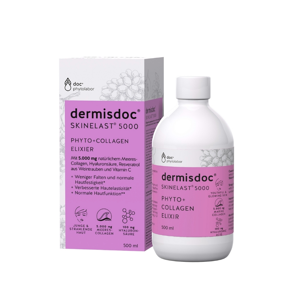 dermisdoc SKINELAST kolagen dodatak je prehrani u tekućem obliku s 5000 mg prirodnog morskog kolagena, hijaluronskom kiselinom (100 mg), resveratrolom iz grožđa (10 mg) i vitaminom C (100 mg).
